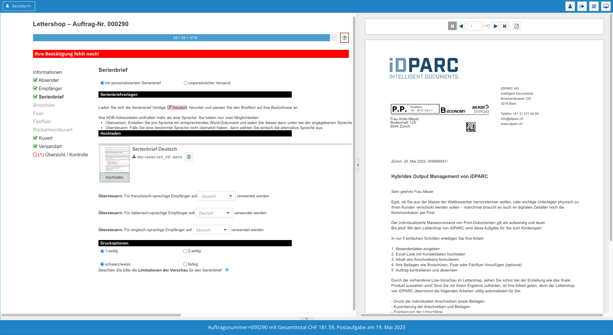 Bestellt eine ETHZ Abteilung im Webshop nun eine individualisierte Massensendung, erhält diese jetzt ein online Gut-zum-Druck (PDF) und die Sendung wird nun vollautomatisch konfektioniert. Da der Auftraggeber das Resultat seiner Sendung nun sofort online begutachten kann, können die Ressourcen des ETHZ Backoffices deutlich effektiver genutzt werden.