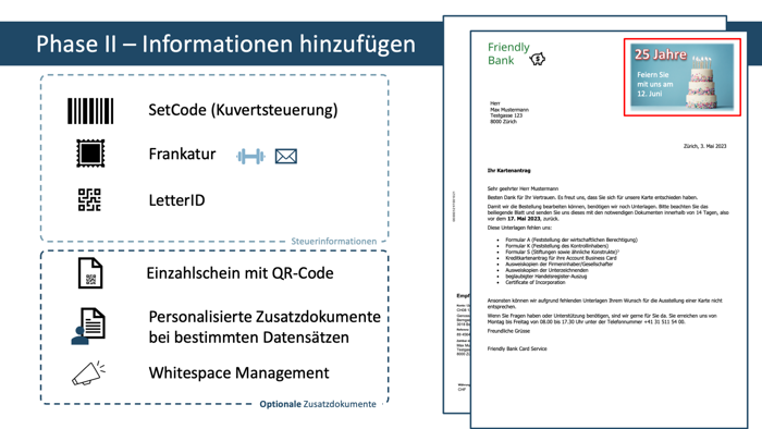 - Vollautomatischer Druck der Dokumente, Zusammenstellung der Dokumente pro Empfänger in der richtigen Sprache, Couvertierung mit Beilagen, Frankierung und Postaufgabe durch Partnerunternehmen
