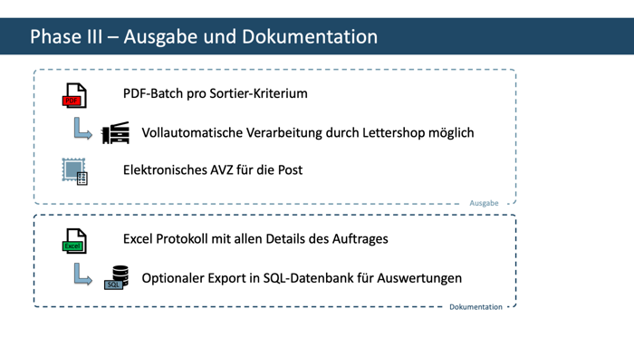 - Pro Sortier-Kriterium erhalten Sie ein vollständiges PDF-Batch. Dieses kann von Drittanbietern vollautomatisiert weiterverarbeitet werden. Ebenfalls erhalten Sie ein elektronisches AVZ für die Aufgabe bei der Post.