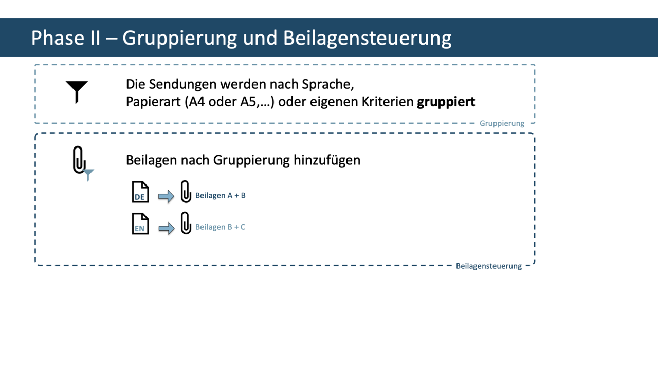 Die Sendungen können nach beliebigen Kriterien (Sprache, Papier, etc.) gruppiert werden. Jeder Gruppierung können eigene Beilagen hinzugefügt werden. -